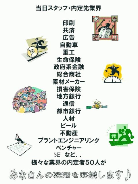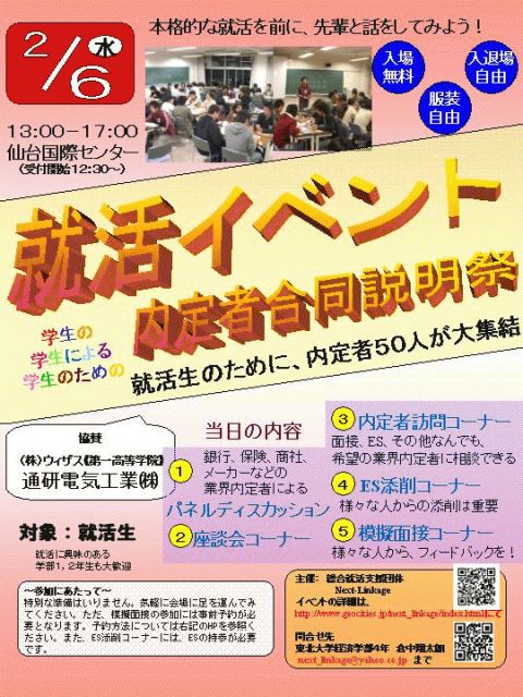 こんにちは。 就活支援団体Next-Linkage 東北大学経済学部4年 倉中翔太朗です。 今日は、『内定者合同説明祭』のご案内をさせてもらいたく書き込みをさせていただきました。 以下が、イベントの詳細となります。 ○△□○△□○△□○△□○△□○△□○△□○△□○△□○△□○△□○△□○△□○ 就活生のために、内定者50人が大集結!!! 内定者合同説明祭で、就活対策はバッチリ! 年もあけ、就職活動を本格的に行っていく時期が近づいてきました! そんな中、総合就活支援団体Next-Linkage (http://www.geocities.jp/ne