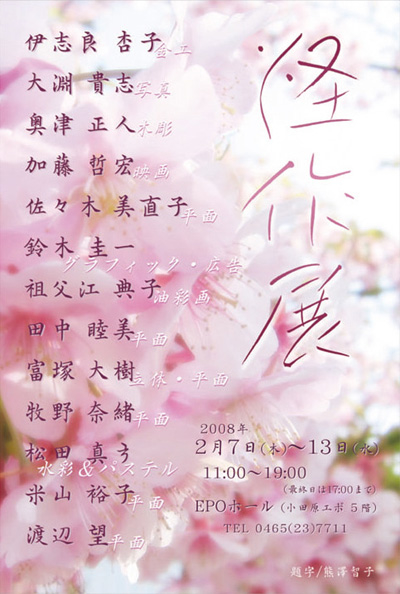 写真はDMと昨年の展示風景。 ※写真はDMと昨年の展示風景 11:00〜19:00(最終日は17:00まで) 小田高卒業生12人と美術科の佐々木美直子先生の作品展示。年に1度の開催で今回は「怪作展」としては9回目。 絵画、彫刻、写真、金工、グラフィックなど多彩なジャンルの作品が集まります。卒業生の出品者は30代から大学生まで。佐々木美直子先生は小田高で15年以上にわたり美術を教えていらっしゃいます。一貫して山羊をモチーフにした油彩、アクリル画を描き続けています。二期展、神奈川県展などの入賞経験があり、画家としても高い評価を