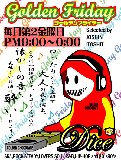 今週の金曜日はGOLDEN FRIDAYの第2回目♪ 残念ながら今回もITOSHITのプレイはお休みですが、 わたくし、ラガじょーしんがガッチリ雰囲気のある曲をセレクトしますので、 皆さん、是非8日金曜日はダイスに遊びに来て下さい☆ 今回はどんなんでイコかな・・・。 前回はSOUL,LOVERS,DANCEHALL CLASSICだったんで、 ゆっくりまったりSKAでもイキましょかっ! リクエスト有る人はドンドン書き込んで下さい(^ヮ^/~~