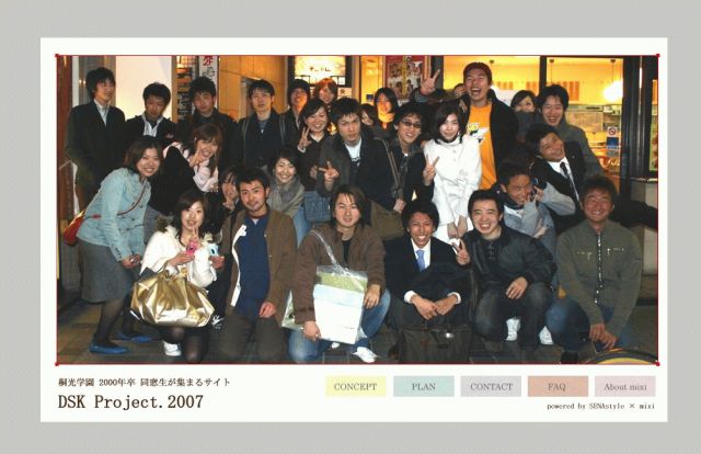 mixiやってる2000年卒の皆さん。同窓会しましょうよ! 知ってる人が一人でもいれば、気付けばみんながお友達。 結局はただの飲み会なので、知り合いと一緒に気軽に参加してみよう! こちらの専用サイトも、mixiに加入していない人へ紹介してみよう。 http://dsk.senastyle.com/2006 ●出欠の管理について 出欠は基本的にmixi上のイベントページ(今見ているこのページ)で行いたいと思います。 理由1:お互い知らない人が多いなか、誰が出席で、誰が調整中で、誰が誰を連れてくるのか、合理的かつリアルタイムで把握するため。