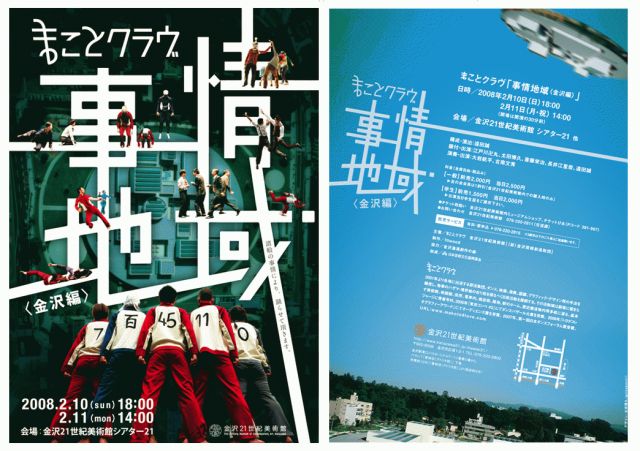 古都・金沢を舞台に、地域の、業界の、団体の、個人の、 その他諸々の“事情”が縺れ合い、反応し合った先で、 劇場と街との境界線の在り処が次第に浮き彫りにされてゆく。 独白形式によるエッセィ風舞台作品。 日時:2008年2月 10日(日) 18:00開演/17:30開場 11日(月・祝)14:00開演/13:30開場 会場:金沢21世紀美術館シアター21 構成・演出:遠田誠 振付・出演:江戸川卍丸、太田博久、斎藤栄治、長井江里奈、遠田誠 演奏・出演:大岩航平、古南文秀 URL:http://www.kanazawa21.jp/th