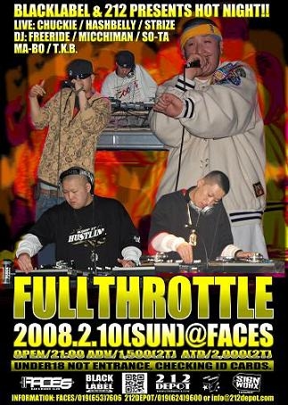 告知失礼します。 『BLACKLABEL & 212 PRESENTS HIPHOP PARTY!!』 “FULL THROTTLE” 2008.2.10(SUN) @FACES OPEN:9PM ADV:\1500(2T ATD:\2000(2T ▼RESIDENT▼ :HASHBELLY :CHUCKIE :FATE :DJ FREERIDE :DJ MICCHIMAN ▼MORE PLAYER▼ :DJ SOTA (Rep.KITAKAMI :DJ MA-BO (MORIOKA UKB :STRIZE (MORIOKA UKB :DJ T.K.B ★ http://ip.tosp.co.jp/i.asp?i=blacklabel お問い合わせ info@212depot.com