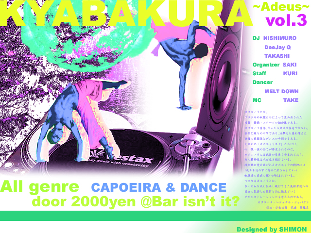 KYABAKURA vol.3  〜Adeus〜 CAPOEIRA&DANCE  All Genre DJ  NISHIMURO        DeejayQ        TAKASHI Dancer METRO        MELT DOWN       and more... side mc SHOW MAKER Organizer SAKI Staff KURI open 22:00〜last door 2000yen(1D) @Bar, isn't it? 2回目まではSQUALLで行われていましたが、今回はisn't it?で行います! 更に皆さんに刺激と心地よい時間を提供したいと思います。 今回も生の音でのカポエィラを演出し