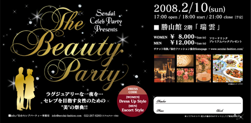 SENDAIセレブパーティーPRESENTS ぴかぴか(新しい)ぴかぴか(新しい)[THE BEAUTY PARTY]ぴかぴか(新しい)ぴかぴか(新しい) ★★★★★★★★★★★★★★★★★★★★★★★★★★★★★★★ ラグジュアリーな一夜を・・・ セレブを目指す女性のための ''美''の祭典!! 『仙台の女性をもっとキレイに』をコンセプトに’06年12月に行われ 大盛況だった''SENDAIセレブパーティ''。『次の開催はいつ??』の 熱い声にお答えしてバージョンアップした第2回を企画中。 でもちょっとその前に・・・参加女性にもバージョンアップしていただくべく ”美”