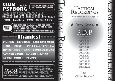 "club Psyborg" 2月10日(日) @仙台MACANA http://www.interq.or.jp/rock/macana/ door 2500yen , Adv 2000yen ドリンク別 一部:LIVE 18:00〜   ケンカキック HASH BALL KAYA ネパール DRAGON×SCREW LED CROWN 二部:club 0:00〜 アンナ(モダン芸者) (独眼竜貿易舎プロデュース) SHOWGO&Mr.HYDOROKOJI etc... 東京<ー>仙台で開催されるクラブ・サイボーグ。 ライブあり、DJあり、ストリップあり目がハート 東京・仙台のアーティストがあつまり皆さんの五感に刺激を注入exclamation ×2 ぜひ北国の寒さを吹き飛ばす熱いパ