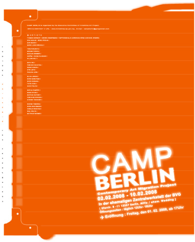 以下、よろしくお願い致します。 CAMP BERLIN Contemporary Art Migration Project 会期:2008年2月2日(土)〜10日(日) オープニング:2008年2月1日(金)17:00〜 会場:Ehemalige Zentralwerkstatt der BVG(旧ベルリン市交通局中央整備工場) ( 住所:Uferstrasse 8 –11, 13357 Berlin Mitte / ehem. Wedding, Germany) 会場時間: 12:00〜18:00 入場料: 無料 総指揮:柳幸典(美術家/広島市立大学芸術学部准教授) 主催: 広島アートプロジェクト実行委員会 共催: 広島市立大学芸術学部 ベルリン・ヴァ
