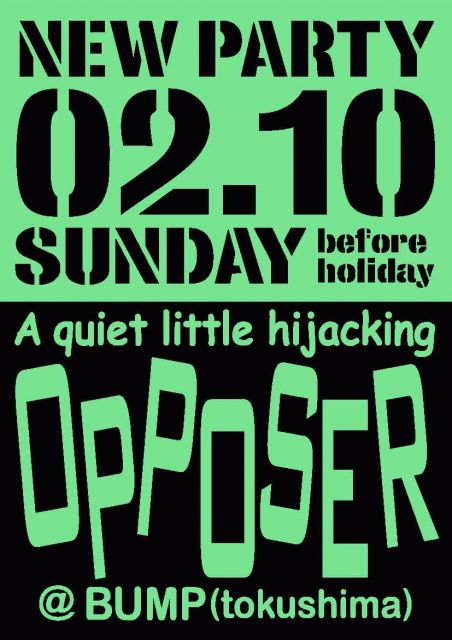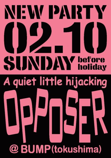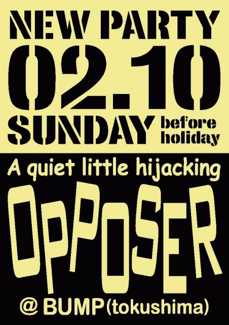 告知失礼します。 2008.02.10(SUN)※before holiday OPPOSER @ soul sauce bar BUMP(tokushima) 徳島でNEW PARTYがスタート!!!! DJがROCKを自分なりに解釈してプレイするというOPENING PARTYには、 昨年夏に剣山で開催された「CYCLE2007」でのすばらしいプレイが 記憶に 新しいGASIRAMが半年ぶりに大阪より来徳!!!! 迎え撃つは徳島変態NEW WAVE/NOISE博士TKC、 ダークでドープなロックをHIPHOP同様に愛し続ける男SUMI、 「98年からFUJI ROCK6年連続で行ってる男だよ僕は!」 らしいMICHIOSHKAの三人!!! 何が飛び出す