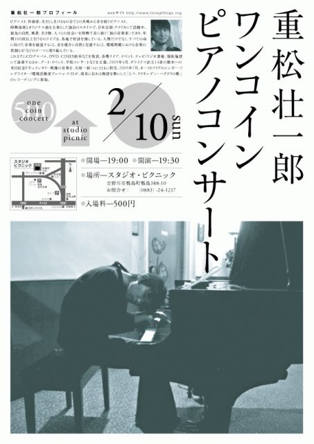 全国を拠点に、年間100回以上のコンサートを行うピアニスト、重松壮一郎。 徳島で初のコンサートを開催します。 初めてということで、今回限り、料金は、1コイン500円です! ぜひともお越し下さい。 お待ちいたしております。 ━━━━━━━━━━━━━━━━━━━━━━━━━━━━━━━━━ 「重松壮一郎 ワンコイン・ピアノコンサート」 ━━━━━━━━━━━━━━━━━━━━━━━━━━━━━━━━━ ■とき 2月10日(日) 開場19:00 開演19:30 ■会場 スタジオ・ピクニック 徳島県吉野川市鴨島町鴨島388-10