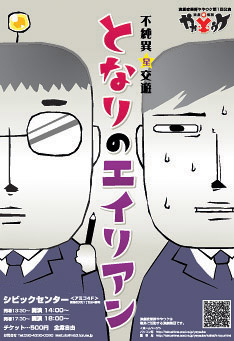 はじめまして。こんにちは。 徳島でややウケという劇団をしております。 第1回公演『〜不純異星交遊〜となりのエイリアン』 を2月10日(日)にシビックセンター(アミコ内4F)で上演します。 第1回公演 『〜不純異星交遊〜となりのエイリアン』 【あらすじ】主人公の細田はごく普通のサラリーマン。 しかし、ある日突然!隣の席の同僚がエイリアンと 入れ替わってさぁ大変。 エイリアンと細田が織りなすボケとツッコミの長編劇! 【日時】2008年 2月10日(日曜日) ■