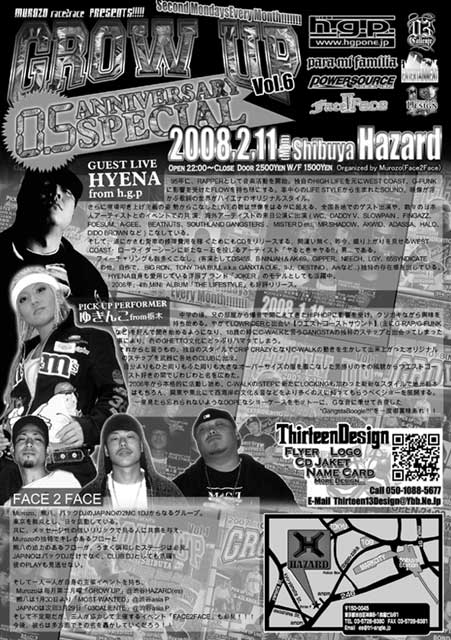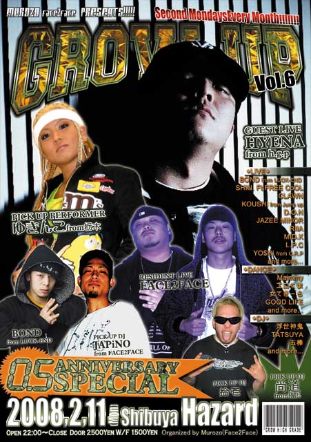 Murozo(FACE2FACE) PRESENTS!!!!! 「GROW UP vol.6」 @渋谷HAZARD(旧es) 〜0.5ANNIVERSARY〜 OPEN22:00〜CLOSE DOOR\2,500 W/F\2,000 お蔭様で、もう6回目です!! 渋谷HAZARD(旧es)では、今までもこれからもおそらく見ることの出来ない顔ぶれです!! GUEST LIVEには横浜h.g.pからHYENA氏が!!! 動画: WHERE MY HOMIES STAY AT / HYENA feat.BIG RON http://jp.youtube.com/watch?v=4dQ_LlhSzzM ツレの唄 / HYENA feat.VEGA-T http://jp.youtube.com/watch?v=-BzV2SvqY-k&feature=related そして