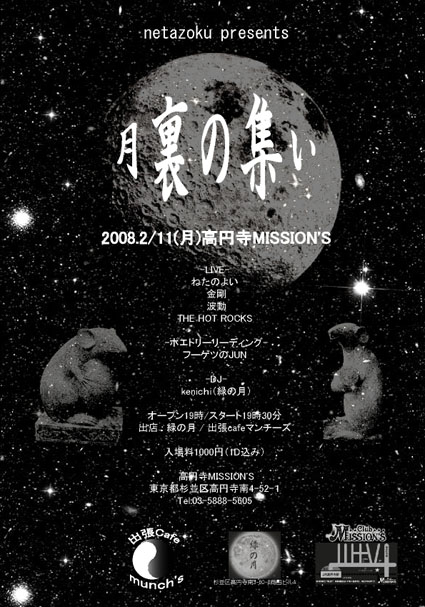 2/11高円寺ミッションズ netazoku Presents「月裏の集い」 LIVE ねたのよい 金剛 波動 HOT ROCKS ポエトリー フーゲツのJUN DJ/keniti(緑の月) オープン19時/スタート19時30分 出店 緑の月 出張cafeマンチーズ ミッションズおでん 雷音堂 入場料1000円(1D込み)