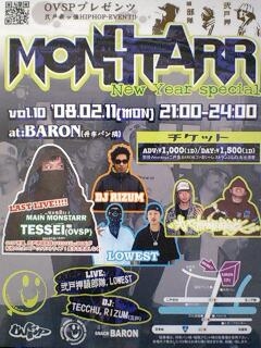 OVSPプレゼンツ 二戸Hiphop Event“MONSTARR”vol.10 年明け一発目special 2008/2/11(連休最終日) 21:00〜24:00 @BARON(丹市パン隣) http://my.minx.jp/gremlin ●MAIN MONSTARR ・TESSEI(OVSP) ●LIVE ・弐戸押韻部隊(OVSP) ・LOWEST ●DJ ・RIZUM ・TECCHU(OVSP) ★OVSP所属のTESSEI(元IRON)が転居の為ラストライブ 是非お見逃しなく ADV:\1,000(1d) DAY:\1,500(1d) 前売取扱/アメリカ屋(久保田),ファミリーレストランよしの,BARON,各出演者 http://x23.peps.jp/ovsp