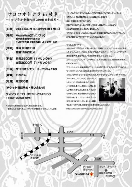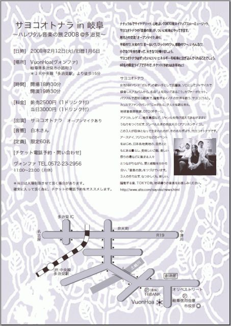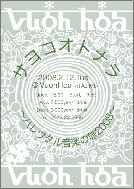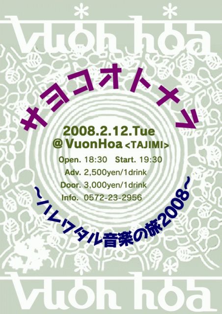 管理人様、告知失礼します。 サヨコオトナラ 〜ハレワタル音楽の旅2008〜 2008.2.12.Tue @ VuonHoa <TAJIMI> Open 18:30 Start 19:30 Adv. 2,500yen/1drink Door 3,000yen/1drink Info VuonHoa 0572 23 2956 ナチュラルでサイケデリック、心地よいTOKYO発ネイティブスローミュージック。 サヨコオトナラの「音楽の旅」が、ついに岐阜にやってきます。 地元との交流「オープンマイク」あり。 平和のワ、大和のワ、ま〜るいワ、びっくりのワっ、感動のワ〜、いろんなワ。 小さなワを持ち寄って、大きなワと鳴り