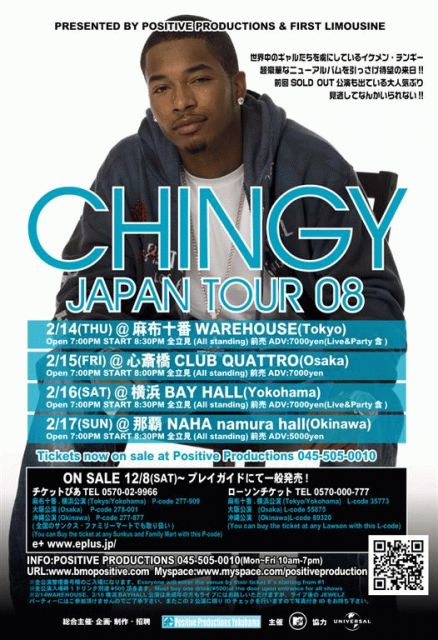 告知失礼致します! 不適切な場合お手数ですが削除願います。 03年のデビュー以来、スター街道を突走るセントルイスのイケメンラッパー☆CHINGYのライブがとうとう明後日のバレンタインデイに東京からスタートします チケットまだ購入していない方は当日券(\8000(沖縄:\6000))も販売いたしますが、公演日前日までローソン、チケットぴあ取扱い店(ファミリーマート・サンクス等)で前売りチケット(\7000(沖縄:\5000))お買い求めできますので、このチャンスを見逃さずに 重