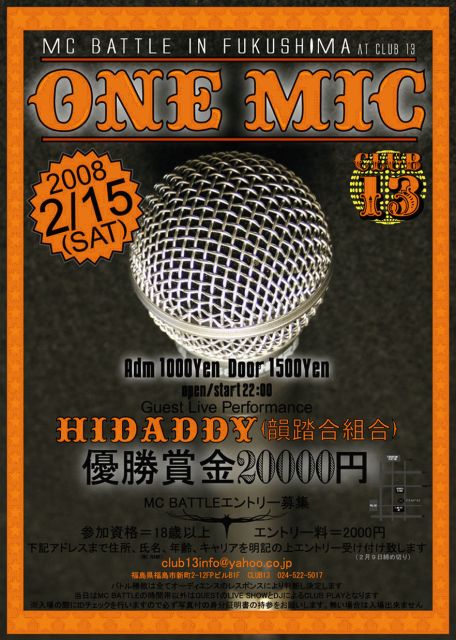2008.02.15(FRI) @CLUB 13 START 22:00 ADM 1000円 DOOR 1500円 GUEST LIVE PERFORMANCE ★HIDADDY(韻踏合組合)★ DJ mambow ONOKAZ MITSU HI-LOW KILLA CANDY ■出場者募集■ 福島市のCLUB13でフリースタイルバトル開催決定 優勝賞金2万円 優勝の他にも協賛店舗より焼肉屋さんのお食事券などあります。 参加資格 18歳以上 エントリー料金 2,000円 エントリー方法 下記アドレスまで必要事項を明記の上エントリー受付 年齢、氏名(MC NAME)、住所、キャリア、エントリー料金の納付方法