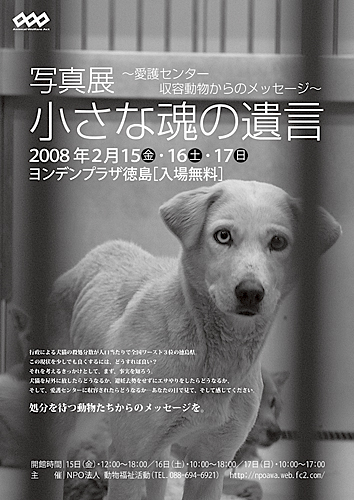 行政による犬猫の殺処分数が人口当たりで全国ワースト3位の徳島県。 徳島を「命を大切にできない県」にしないためには、どうすればいいでしょうか? “たかが動物”…そう思う人も、まずは、その事実を知ってください。 犬猫を屋外に放したらどうなるか… 避妊去勢をせずにエサやりをしたらどうなるか… 動物を棄てたらどうなるか… 安易に子供を産ませたらどうなるか… 処分されるために収容された動物達。彼らのメッセージを受け取ってください。 【写真展「小さな魂の遺言 〜愛護センター収容動物からのメッセー