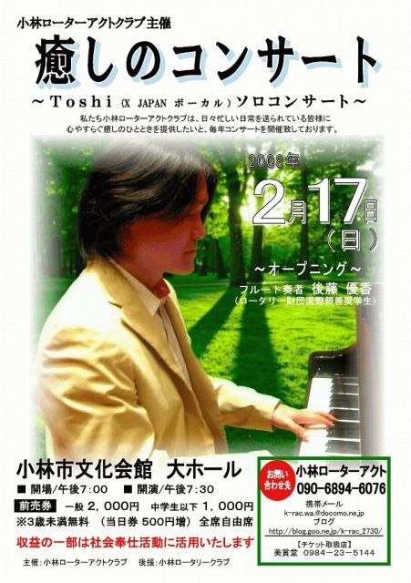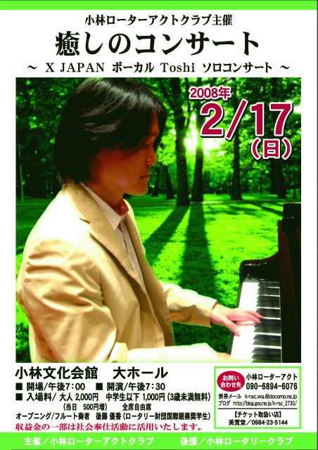 はじめまして 小林ローターアクトクラブよりコンサートの告知をさせて下さい ------------------------------------------------------- 癒しのコンサート 〜Toshi(X JAPAN ボーカル)ソロコンサート〜 ------------------------------------------------------- X-JAPANのボーカリストとして一世を風靡したが1997年人気絶頂の時に脱退。 ロックスターから癒しのアーティストへ方向転換する。 全国を巡り、各地コンサートホールや学校など様々な場所でコンサートを行う。 またコンサートの合間に地域の各種福祉施設を訪れ