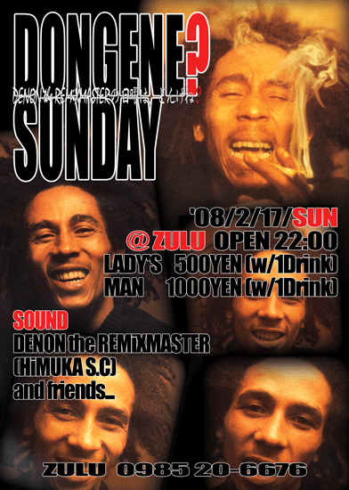 今週日曜日! '08/02/17/SUN ZULU PRESENTS... ◆DONGENE?SUNDAY◆(DENONの日曜はどんげね?) @ZULU(宮崎市中央通) OPEN22:00 LADY'S 500YEN(w/1DRiNK) MEN'S 1000YEN(w/1DRiNK) SOUND:DENON(HiMUKA SC) AND MORE FRiENDS ◎ファンデーション、ダンスホールクラシック等が中心ですが、 毎回「これぞラガ!」なるものがジャンルレスでかかります。 グッヴァイブスでのご来場お待ちしてます!