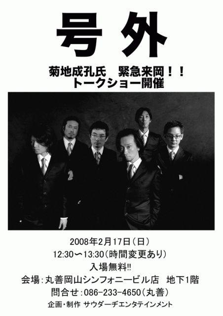 3/13岡山ルネスホールでのライヴを記念して、 菊地成孔のフリートークイベントを行います! ■日時:2007/2/17(日) 12:30-13:30 ■会場:丸善岡山シンフォニービル店 ■内容:トークイベント *観覧フリー お問い合わせ:丸善岡山シンフォニービル店 Tel 086-233-4663 いよいよです! 菊池さんがやってきます。 しかも!かなり近くで、あの饒舌なトークを堪能出来ます。 彼の言葉力を知らない方、先ずはこちらを↓ http://www.kikuchinaruyoshi.com/ イベントに関してはサウダーヂHPもご覧下さい http://www.saudade-ent.com/in