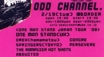 □2008年2月19日(火) @広島BORDER -ODD CHANNEL. section two- ONE MAN STAND(UK) DREX(浜松) SPRINGERS(東京) ABDUCTED PERSEVERE CONCRE ROMPSIER HOT SHOTS ADV 1800円/DAY 2300円 OPEN 19:00/START 19:30