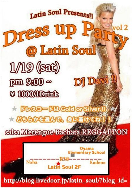 毎月第3土曜日に北谷の&〜and〜で行なっている、Fiesta dela Salsaが今月はお休みとなり、今回は、Latin Soulにて、Dress up Partyが開催されるそうで〜す!