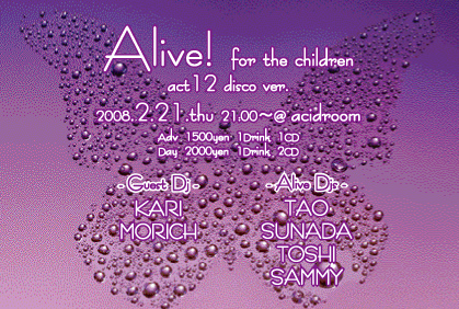 (゚Д゚)ノ ァィ ALIVE!です。 毎月最終木曜ですが 今回1週間早いスケジュールです☆彡 今回はDj Sammyが企画者です。 DISCOっぽい感じらしいですよ☆彡 以下詳細です。 ALIVE!for the children act12 2.21.2008 21:00 start @acid room s4w6 taiki bld B3F system \1500(incl.1drink&1mixCD) \2000(incl.1drink&2mixCD) DJ Tao Sunada toshi Sammy Guest Dj Kari Morich みなさんお待ちしております☆彡 木曜なんで金曜日も出る人は2連チャンだね☆ 楽勝楽勝♪