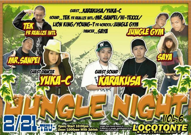 告知失礼します。 JUNGLE GYM SOUND PRESENTS <<JUNGLE NIGHT vol,6>> 2008,2,21(THU) LOCOTONTE(S7E4ススキノ会館BLD4F) OPEN/START 1000yen WITH1drinks =GUEST SOUND= KARAKUSA =GUEST DANCER= YUKA-C -SOUND- TEK from REALIZE intl MR.SANPEI HI-TEXXX LION-KING YOUNG-T from40ROCK JUNGLE GYM -DANCER- SAYA 今回のゲストは小樽からKRAKUSA,ダンサーです! レギュラーサウンド陣、ダンサーの若手も盛り上げて行きますので 是非是非みなさんロコトンテに集合ですー