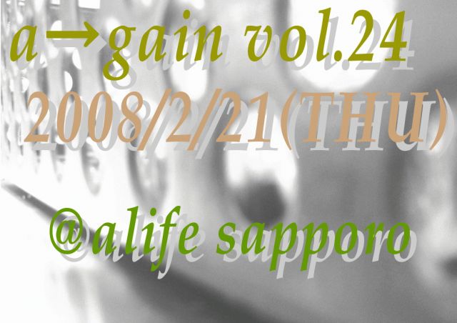 ■2008/2/21(THU) a→gain vol.24 alife sapporo (南4西6タイキビルB1) ADV ¥1000 1D DAY ¥2000 1D ※当日キャッシャーでDJ名を出すと前売りにてご入場できます。 参加者が多数のためDJ名のみでお願いします。 ■DJ ・HOMLESSS http://mixi.jp/view_community.pl?id=661227 HOMLESSSコミュニティー ・MASAHIRO3.84 (COOL.SOUNDS.PROJECT) http://mixi.jp/view_community.pl?id=2449008 DJ MASAHIRO 3.84 コミュニティー ・AKIRA (HOUSE GROOVE) ・mitzthelive (NOTE PROJECT) ・S@CHI (SOLEIL) ■