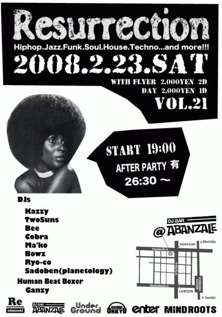 こんばんは、kazzyと申します。 GANZYの出演イベントの告知させていただきます。 『Resurrection vol.21』 2/23(SAT)@DJ Bar abanzale [http://mixi.jp/view_community.pl?id=322870] (MAP→http://www.a-iwate.com/osusume/7917map.html) start 19:00 finish 26:00 (AfterParty 26:30〜) Charge: with flyer.\2000/2drinks day \2000/1drink (追加Drink:\1000/2drinks) Genre: HipHop, Jazz, Soul, R&B, House, Techno and more... DJs: kazzy Bee Twosuns Cobra Ma'ko Bowz Ryo-co SADOBE