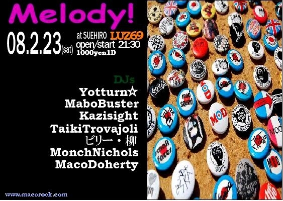 Melody! ■2008/2/23 SAT 21:30- ■@LUZ69 ■DJ Yotturn☆ Mabo Buster Kazisight Taki Trovajoli ビリー 柳 Monch Nichols Maco Doherty ■DOOR 1000yen(1D) お待たせ!! Melody @LUZ69 二回目の開催です!! 前回はかなり盛り上がりましたね!! http://mixi.jp/view_diary.pl?id=478431466&owner_id=5634255 以下、 マコロック談↓ Melody! こんにちは、今回はLUZ69さんでの開催です。 21:30start 1000円1D。 新旧ジャンル織り交ぜのでテキトーにやってます。