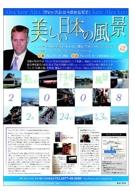 D&DEPARTMENT PROJECT KAGAWA kumi*さんよりすごい貴重な講演会の情報提供です。 http://mixi.jp/view_bbs.pl?id=27962772&comment_count=0&comm_id=2581078 以下 引用掲載。 とても興味深い話題だったので、ここでご紹介致します。 みなさんもご都合がよければ如何でしょうか。 アレックス・カー氏講演会『美しい日本の風景』 ●とき 2008年2月24日(土) 15:00〜(14:30〜開場) ●ところ ユープラザうたづ ------------------------ 【関連記事より(四国新聞社)】 町並み生かすまちづくり学ぼう−宇多津で