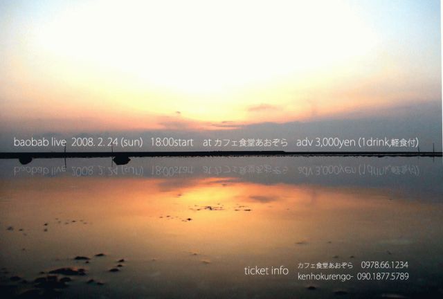 baobabライブの告知です。 杵築市ならではの趣のある和な空間でbaobabの新曲たちを堪能できると思います。 あおぞらオーナーの作る料理も素晴らしくうまいです。 おいしいものを食べながら癒しmusic。 贅沢な時間を味わってほしいと思います。 料金は1ドリンクと軽食付きで3,000円です。 場所的に30人限定となってますので、なるべく早めの予約を! こちらからも告知しています↓ http://kentaro-kouno.com