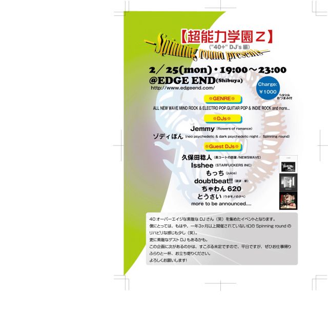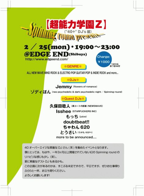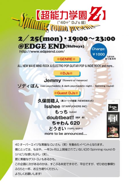 エッジエンドにキャンセルが出たので急遽イベントを、やる事となりました。。 イベント繋がりの関係者の皆様には、唐突ですが、どうかお許しくださいませ。 ―Spinning round presents― 【超能力学園Z("40+" DJ's編)】 2/25(mon)@EDGE END(Shibuya) http://www.edgeend.com/ 19:00〜23:00 ¥1000(1drink おつまみ付) ※GENRE※ ALL NEW WAVE MIND ROCK & ELECTRO POP.GUITAR POP & INDIE ROCK and more... ‐DJ‐ *Jemmy(flowers of romance) *ゾディぽん(neo psychedelic & dark psychedelic night/Spinning round) ‐Guest DJ‐ *久保田稔