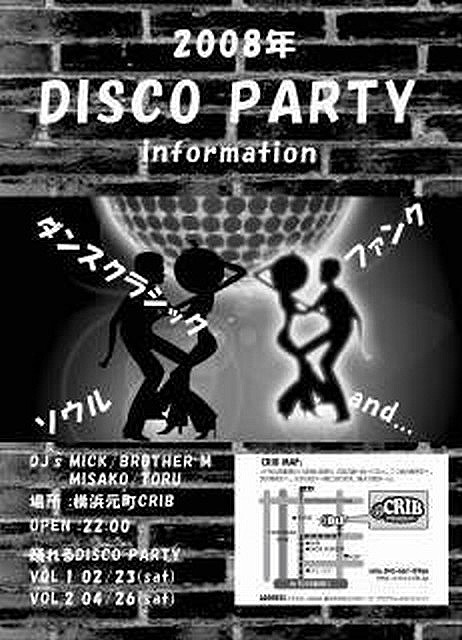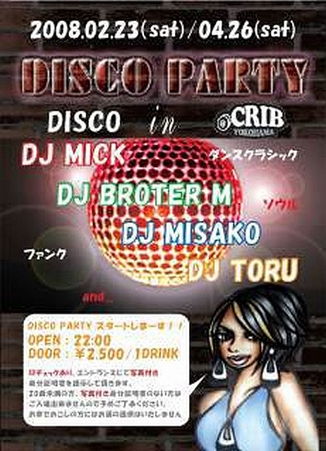 mamiさん失礼します クラブイベントの告知をさせて頂きます ★ YOKOHAMA "DISCО" VОL.1 ★ 元町@CRIB、DISCO PARTY 第一回は2/23土曜日、第二回は4/26土曜日の2回開催します。 ☆2年前まで横浜タイクーンで行われていた「DISCO☆CAFEE」のスタッフ&DJでの開催 横浜ならではのステップ!ハマチャチャ!フリーダンスを楽しめるダンスイベントです ハマ特有の雰囲気の中=ダンスクラシック、ソウル、ファンク、ディスコサウンドを選曲 お酒の種類も豊