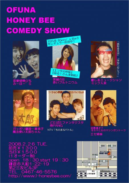告知させてください。 2月26日火曜日 ミック入来 Presents〜爆笑ライブ2008 vol.3〜 【会場】 大船HONEY BEE 〒247-0056 鎌倉市大船1-22-19 第2三友ビル3F 【チャージ】¥1500+1オーダー (前日までの予約で¥1300) チケットのお問い合わせ→TEL0467-46-5576(16:00〜23:00) 【ショータイム】 19:30〜 (open18:30) 【大船ハニービーHP】http://www.l-honeybee.com/Access.html 【最寄り駅 】 大船駅(JR東海道線、JR横須賀線、JR京浜東北線、湘南モノレール) 【アクセス】