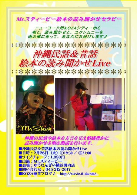 沖縄唄&沖縄民話の読み聞かせLIVE♪ 関東地域にお住まいの方へ告知です。 沖縄で司会業やライブ等の活動をしているタレントのMr.スティービー http://stevie.ti-da.net/ といいます。 ライフワークとして行っているのが、絵本の読み聞かせや朗読にピアノのバッキング演奏を取り入れた長編作品の“絵本の読み聞かせ”&朗読&歌とお喋りの「大人の読み聞かせライブ」http://stevie.ti-da.net/c89985.html を行っています。 今回はサポートミュージシャンがいないため、沖縄の方言を交え、沖縄民話&沖縄の曲を中心に唄う「大人の読み