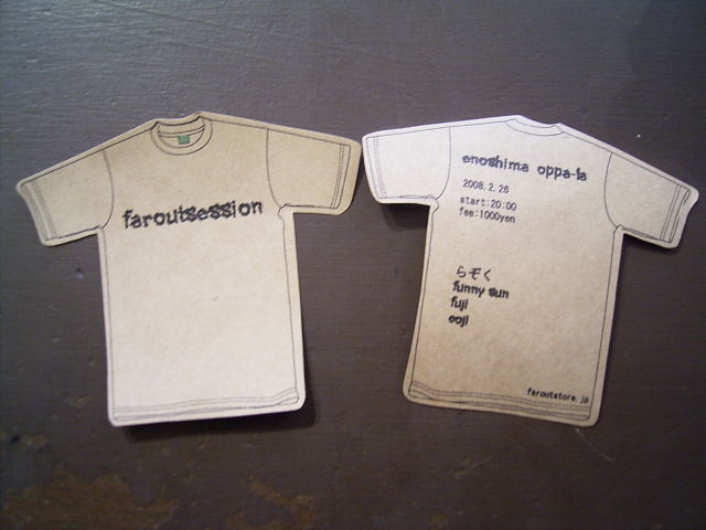 2008年1発目のFarOutSessionです。 FarOutSession 2/26 江ノ島おっぱーら 20:00スタート 1000円(1ドリンク付) 今月は、らぞく2セットです。 DJは、湘南を中心に活動しているFunny Sunとfuji、 FarOutStoreからは、私cojiが参加します。 タイミング合わせて遊びに来てくださいね。。