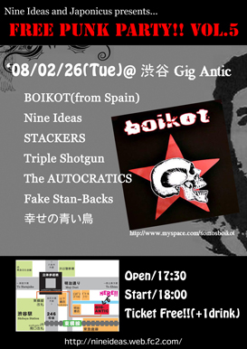都内で活動しているNine Ideasです!! 告知させてください!! 毎回、すべてのお客を笑顔にさせてきたFree Punk Party!!に ヨーロッパを代表するスペインの大御所パンクバンド・BOIKOTが参戦決定!! BOIKOT以外のバンドも各シーンで高い評価を得ているバンドばかりを集めました! この熱いイベントを見逃すな!! Nine Ideas presents.... 【Free Punk Party!! vol.5】 ★2008/02/26(火) −at 渋谷Gig Antic □Open/17:30 Start/18:00 □Ticket Free, Only drink charge!! −出演バンド ■BOIKOT(from Spain) http://w