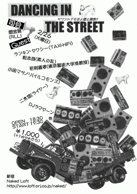 どうも、RLLの∞+∞=∞です。最近あんまりデモも無いなあ、寒いし、雪ばっかりだし・・・ と、少々まんねりで停滞気味なみなさん!そんな退屈を吹き飛ばすようなヤばいイベントをやります。タイトルは「ダンシング イン ザ ストリート サウンドデモだよ路上開放!!」とにかくいろんな場所でいろんなヤツらがすき放題音楽やら主張やらをダンスしつつ路上をジャックするサウンドデモが、どんどんこの国に広がっていて、もう九州から北海道まで、仙台、京都、名古屋、もちろん東京でもいろんなサウンドデモがあって、そして多分これからは、もっと