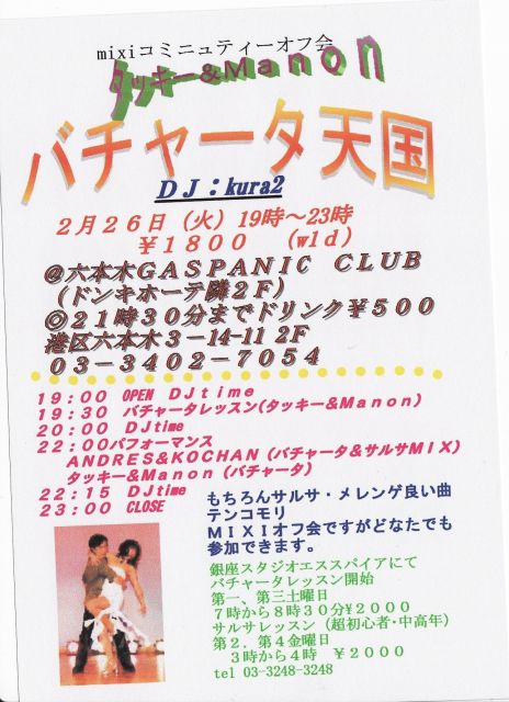 メンバーの皆さま、お待たせいたしました。 2月のバチャ天のご案内です。 今回、また会場を新たにしての開催となりました。 その会場とは。。。。 その会場とは。。。。 若者のクラブシーンの最先端、あの六本木GASPANIC CLUBです。 既に行ったことのある方も、まだ行ったことのない方も、バチャ天@GASPANIC CLUBで盛り上がりましょう! ■日時:2月26日(火)19:00〜23:00 ■場所:六本木GASPANIC CLUB 港区六本木3−14−11 2F 03(3402)7054