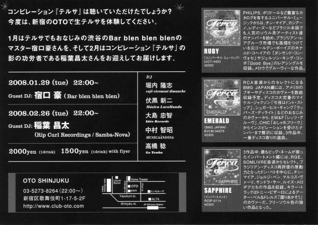 コンピレーション・アルバム『テルサ』は聴いていただけましたでしょうか? 今度は、新宿OTOで生テルサを体験してください。 今月は、コンピレーション・アルバム『テルサ』の影の功労者である稲場昌太さんをゲストDJとしてお迎えしてお届けします。 そして、今月と来月は「SERGIO MENDES meets TERCA」ということで、セルジオ・メンデスの最新作『モーニング・イン・リオ』の発売を記念して開催します。 当日のご来場者の方に先着でセルジオ・メンデス特製ストラップをプレゼント!! ぜひ遊びにいらしてください。 *テルサ