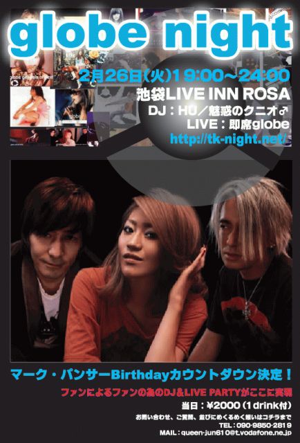 マーク・パンサーの誕生日カウントダウンを皆さんで! 仕事、学校帰りにひと踊りしてみませんか? 一緒にマークの誕生日をお祝いする一夜です♪」 即席globe PRESENTS globe night〜マーク・パンサーBirthday〜 日時:2008年2月26日(火)19:00〜24:30 !!! 会場:池袋 LIVE INN ROSA 住所:豊島区西池袋1-37-12ロサ会館B2 http://www.live-inn-rosa.com/ DJ:HU(即席globe)/けんけん/ヒロ☆マクスウェル/eye/魅惑のクニオ♂ LIVE:即席globe \2000(1drink付) イベント公式サイト http://tk-night.net/