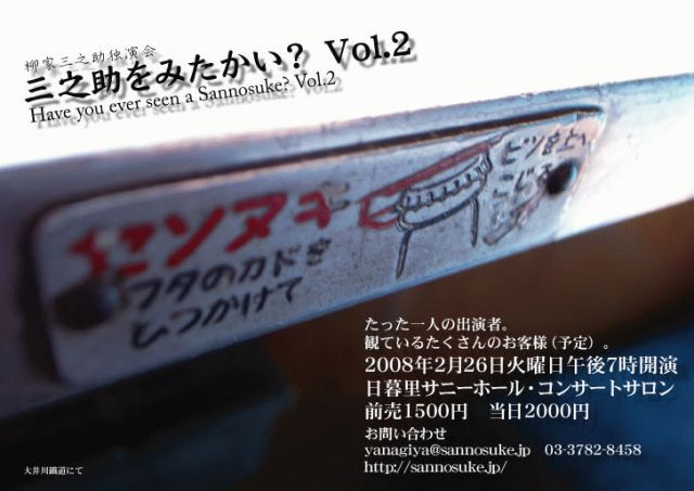 三之助さんの落語も楽しみだけど、三之助コミュの皆さんにお会いできるのも楽しみです。 にぎにぎしくご来場、お待ちしております。 2月26日(火) 19時30開演 (19時開場) 日暮里サニーホール・コンサートサロン http://www.cbc-sunny.jp/HOME.html#map 前売1500円 当日2000円