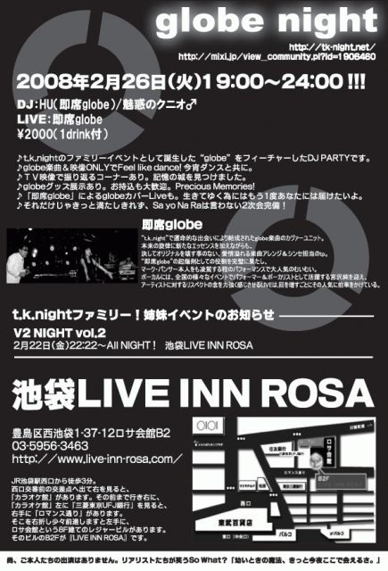 マーク・パンサーの誕生日カウントダウンを皆さんで! 仕事、学校帰りにひと踊りしてみませんか? 一緒にマークの誕生日をお祝いする一夜です♪」 即席globe PRESENTS globe night〜マーク・パンサーBirthday〜 日時:2008年2月26日(火)19:00〜24:30!!! 会場:池袋 LIVE INN ROSA 住所:豊島区西池袋1-37-12ロサ会館B2 http://www.live-inn-rosa.com/ DJ:HU(即席globe)/けんけん/ヒロ☆マクスウェル/eye/魅惑のクニオ♂ LIVE:即席globe \2000(1drink付) イベント公式サイト http://tk-night.net/ ★t.k