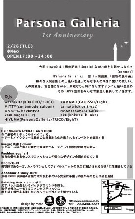 お知らせです♪ 「笑顔」をテーマに始めて1年経ちます* ファッション性のあるデイパーティの「pA-sO」 テーマを 実行してきてる 温かく良いパーティになってきました! もしよろしければ 一緒にみなさんで楽しみましょーぉぃ^^ 詳細はこちらです* ====================== 2/26(TUE) *1st Anniversary* 【Parsona Galleria】@Neo **** mixi コミュ ****** →http://mixi.jp/view_community.pl?id=2760993 OPEN 17:00 CLOSE 24:00 entrance \2500 discou