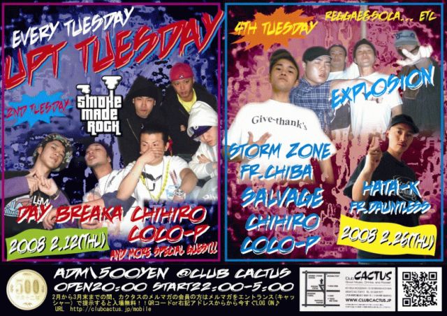 ■2/26(THU)■ 「UPT TUESDAY」 ☆ADM 500YEN☆ しかも今なら3月までクラブカクタスのメルマガ会員になって送られてきたメルマガを見せると入場無料!!!!!ですのでお試しください☆ OPEN 20:00〜 START 22:00〜5:00 EXPLOSION STORM ZONEfr.CHIBA HATA-K fr.DAUNTLESS SALVAGE CHIHIRO MASTER WHISTLE (COCO-P ) Good Music,Drinks,and Foods★ ◆FOOD \600〜 @Club CACTUS 港区南青山1-15-18リーラ乃木坂B1F ?:03-3408-9577 <アクセス> 東京メトロ千代田線 乃木坂駅3番出口より徒歩1分