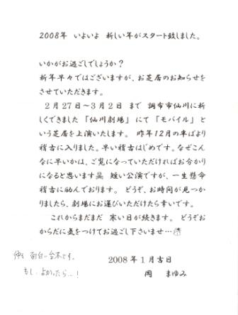 岡まゆみ(五十嵐まゆみ)の舞台のお知らせです。 付属を卒業して34年余り、劇団四季を経て、数々の舞台に、ドラマに、メディアに活躍する彼女です。 学生時代から、私は舞台女優になると、努力を惜しまず、あらゆるお稽古に精を出していました。 初志貫徹、ますます真摯な姿勢で女優の道を歩んでいます。 いつも頑張るイガラシは同級生の誇りでもあります。 生の舞台は、さすがに迫力があり、彼女の魂を是非ご覧下さいませ、 応援団として、岡まゆみからのメッセージをアップします。 よろしくお願いします。 調布市せんがわ劇場オー
