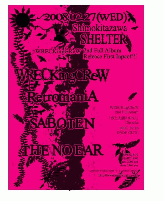 WRECKingCReW 2ndFULLALBUM「夜と太陽のDNA」 レコ発初日まであと10日を切りました!! というわけでレコ発初日!!! みなさんガッツリ遊びに来て下さい! 2008/2/27(水) 下北沢SHELTER WRECKingCReW http://www.myspace.com/wreckingcrewjapan RetromaniA http://www.retromania.org/ SABOTEN http://www.sabotenrock.com/ THE NO EAR http://www.myspace.com/thenoear 18:30 / 19:00 2000 yen / 当 2300 yen 【チケット】 ローソンチケット: L 39575 チケットぴあ : P 281-612 WRECKingCReWツアーT