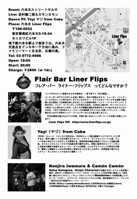 「フレアー・バー」をご存知でしょうか?トム・クルーズが『カクテル』で演じていた、瓶をジャグラーのように回しながらカクテルを作るバー・エンタテインメントです。最近六本木にオープンした本格的フレアー・バー『Liner Flips』が会場です。ガスパニックの向い、駅から5,6分です。