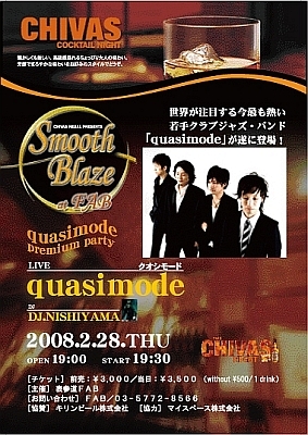 - quasimode premium party-CHIVAS REGAL presents. Smooth Balze 2月28日(木)@表参道fab シーバスリーガルというウィスキーのイベントです! 皆様もう予約はしてくれたでしょうか?? ●当日はシーバスリーガルを使ったカクテルの紹介や、 カクテルショーなんかも開催予定です! *人数限定のプレミアムパーティですので、 チケット販売を早期終了する場合がありますのでご予約はお早めに! 皆様にお会いできるのを楽しみにしております! ●ゲストミュージシャンも参加してセッションなんかもやる予定です! 〜詳細は下記参